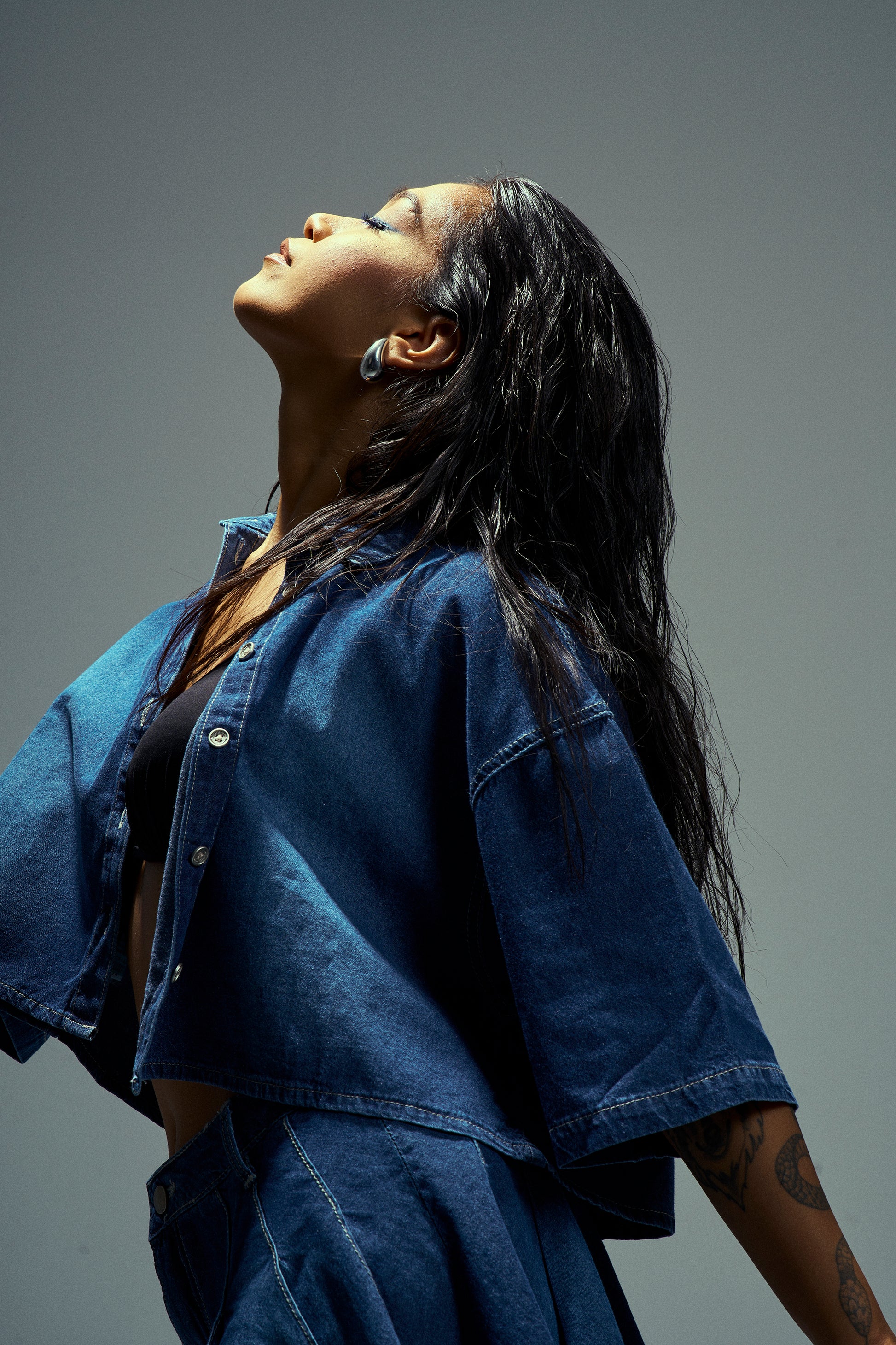 Raw’s cropped loose fit shirt in blue wash, made of organic cotton blend with front buttoned, drop-shoulders loosy sleeves and back brand signature label on.