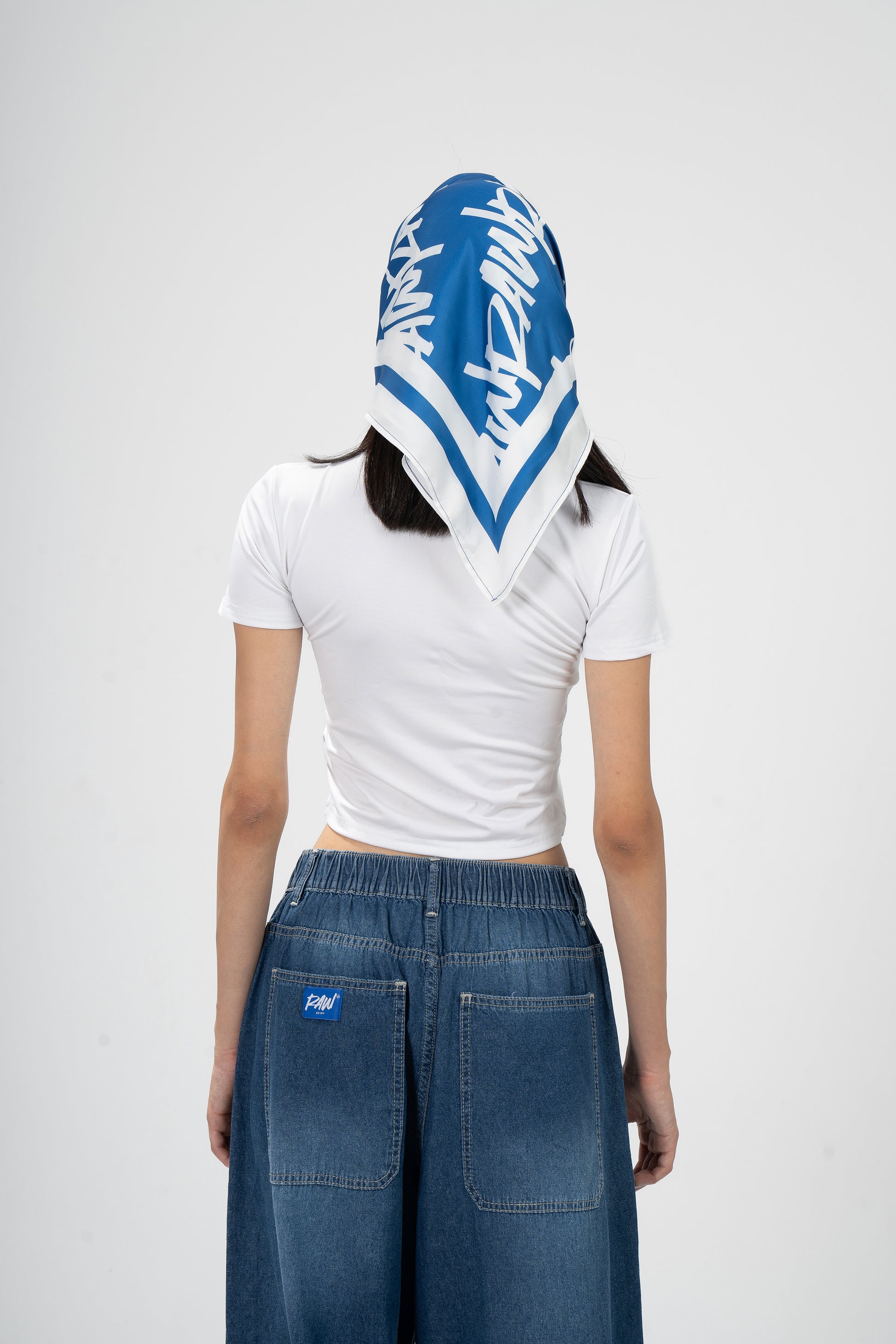 Raw’s Blue denim trousers, made of organic cotton blend, tailored to a wide baggy elasticated leg, high elasticated waist and featuring side pockets, with brand signature label on the back left pocket.